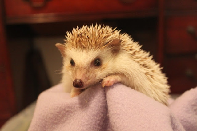 Over the past few days, we've been coming up with pet names for her -- my new one today was "Miss Grumpy Pins," since she is decidedly unfriendly when roused during the day (hedgehogs are nocturnal). She curls herself up into a tight ball of prickles and gets huffy by shivering and sniffing ominously.